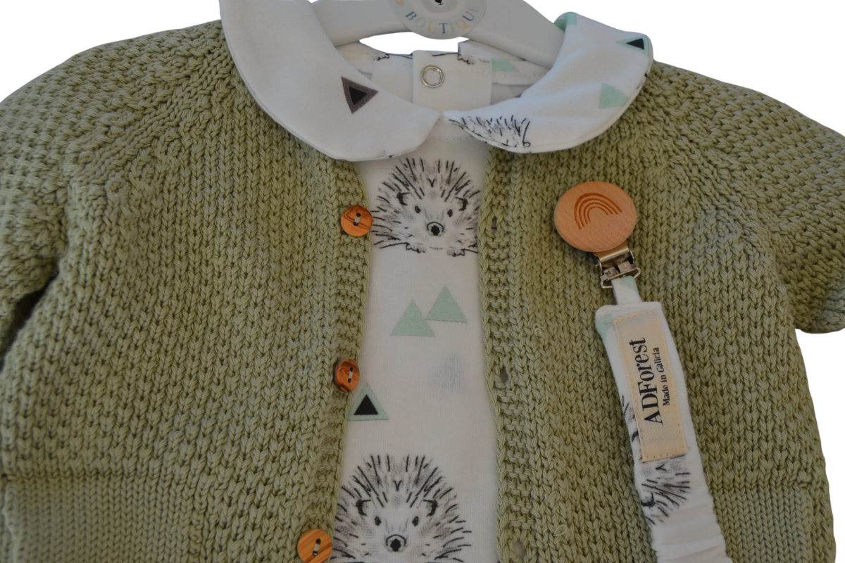 Te regalamos: el sujetachupetes en el mismo estampado erizos a juego con el pijama y la chaqueta.